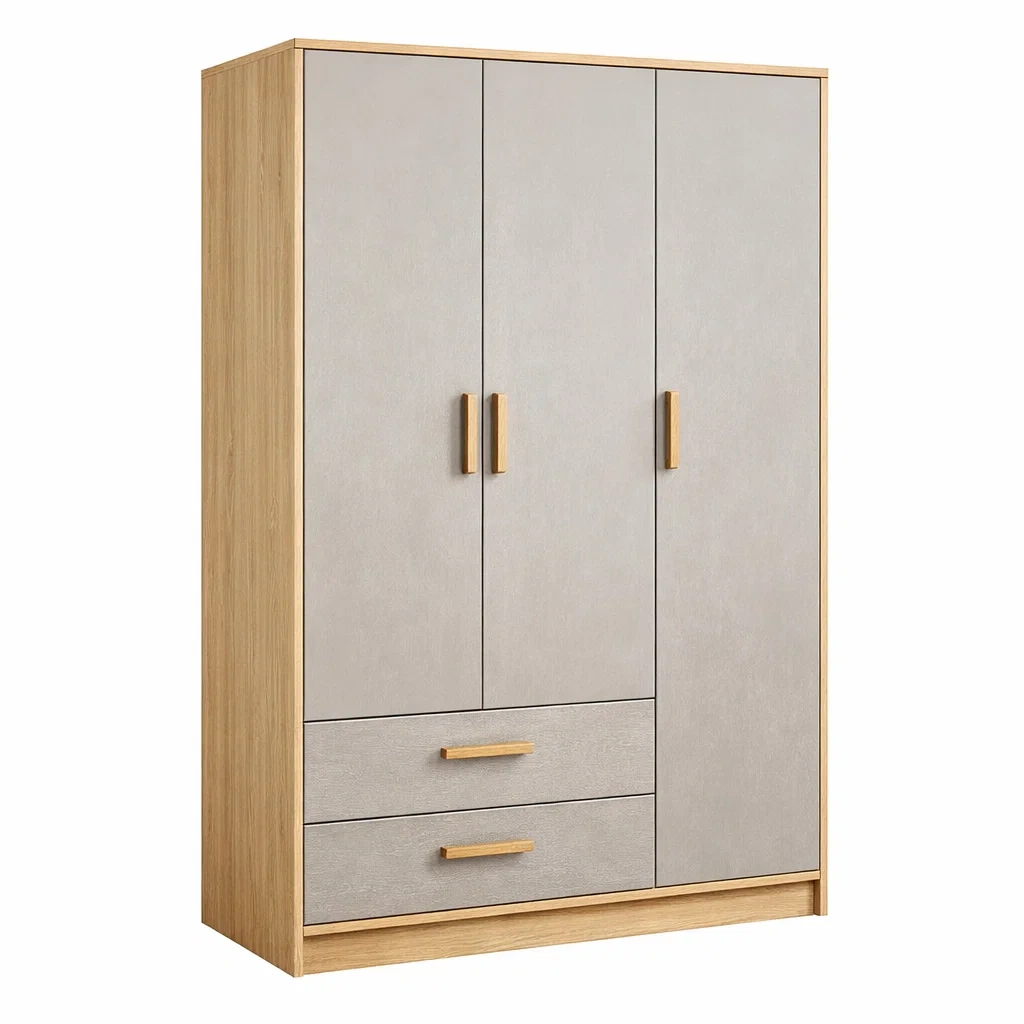 Armoire en bois MDF gris et chêne avec 3 portes et 2 tiroirs