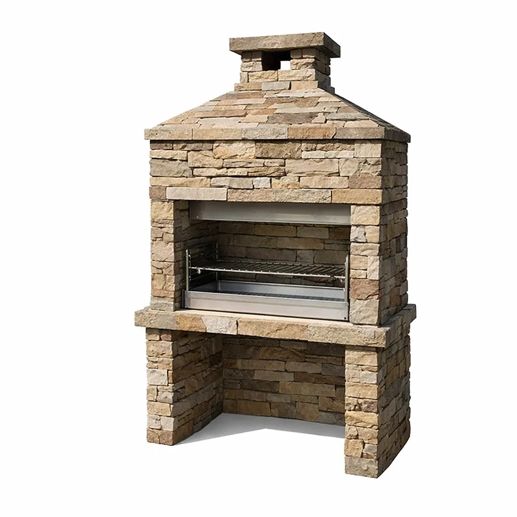 Barbecue en pierre reconstituée avec grille en acier inoxydable. Dimensions : 210 cm de hauteur, 120 cm de largeur, 60 cm de profondeur. Poids : 250 kg. Utilisation compatible avec bois ou charbon. Couleur beige. Nettoyage recommandé avec eau savonneuse douce. Éviter exposition prolongée à l'humidité.