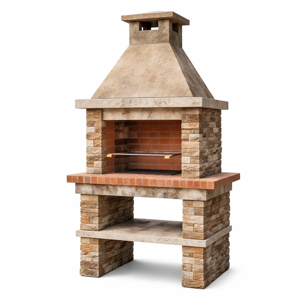 Ce barbecue fixe est fabriqué en pierre naturelle avec des briques réfractaires, offrant une durabilité pour une utilisation en extérieur. La grille est en acier inoxydable, assurant une résistance à la chaleur et à la corrosion.